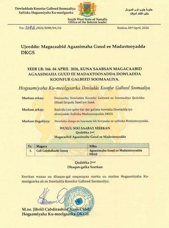 Hogaamiyaha Ku-meel-gaarka ah ee Koonfur Galbeed Mudane Jabriil Cabdirashiid Xaaji ayaa Cali Cabdulaahi Isaaq U-Magacaabay Agaasimaha Guud Madaxtooyada Dowlada Koonfur Galbeed.