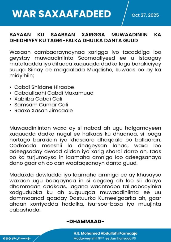 Madaxda dowladda iyo laamaha amniga ee ay khusayso waxaan ugu baaqaynaa in si degdeg ah loo sii daayo dhammaan dadkaas, lagana waantoobo tallaabooyinka xadgudubka ku ah xuquuqda muwaadiniinta ee uu dammaanad qaaday Dastuurka Kumeelgaarka ah, gaar ahaan xorriyadda hadalka, isu-soo-baxa iyo muujinta cabashada.