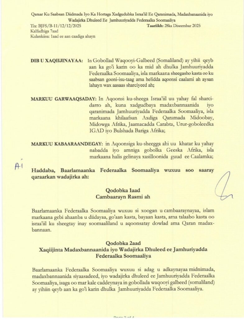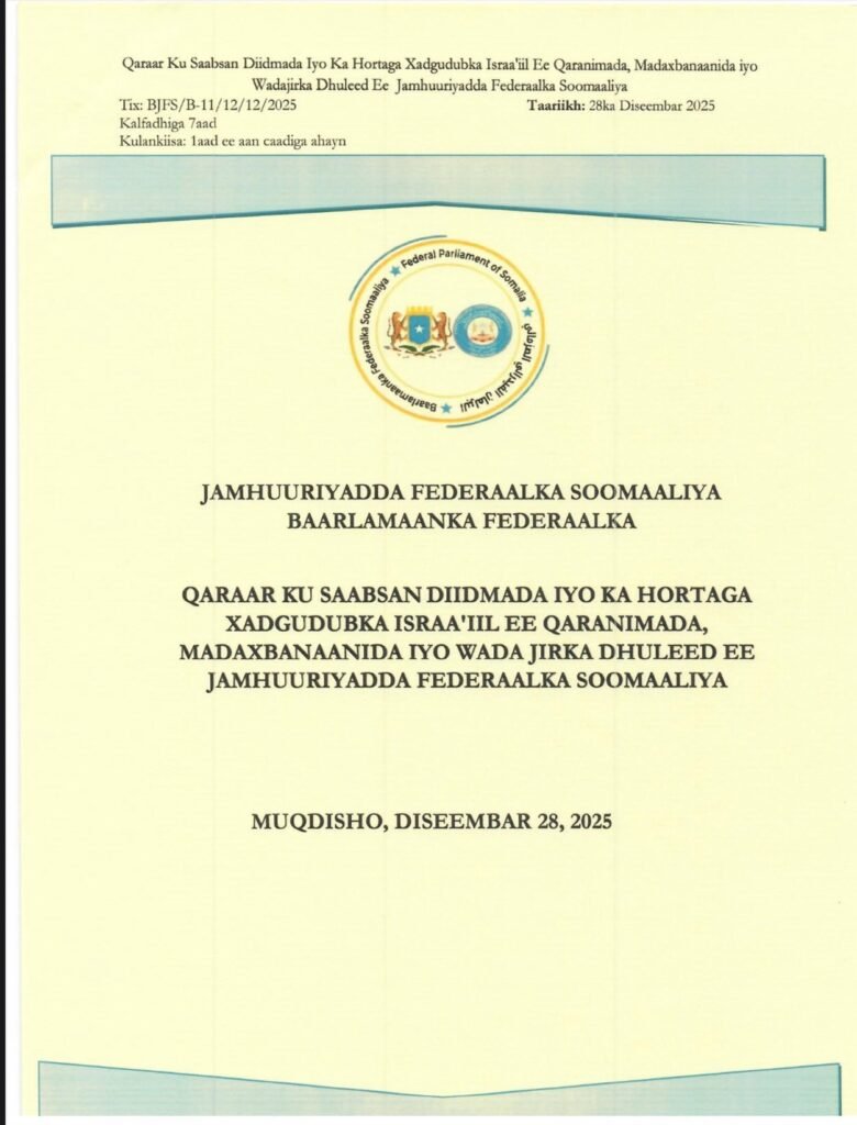 Qaarka Baarlamaanka ayaa si cad loogu diiday damaca Yuhuuda ee kala qeybinta Soomaaliya, sido kale waxaa la caddeyay mowqifka rasmiga ah ee Baarlamaanka Soomaaliya.