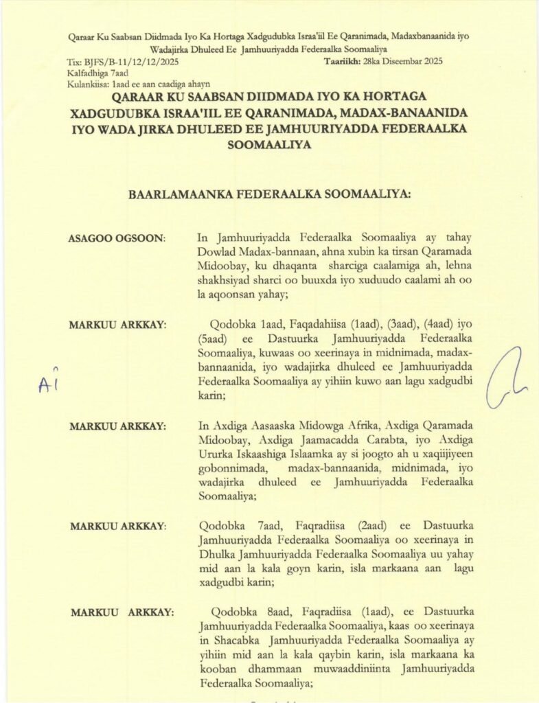Halkan ka Akhriso qaraarka Baarlamaanka ee xadgudubka Israa’iil iyo arrinta Somaliland