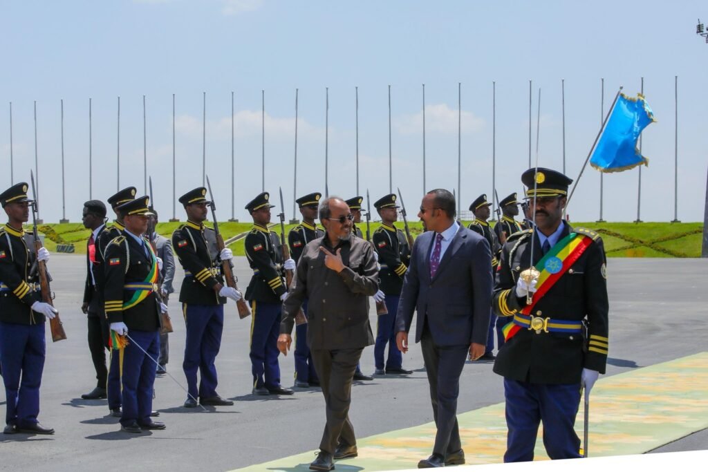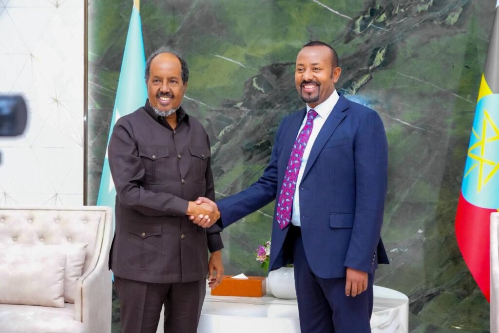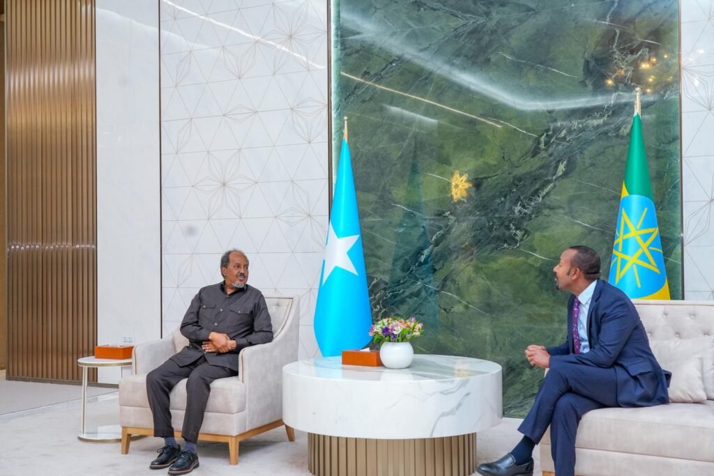 Addis-ababa. Oktoobar 12, 2025; Madaxweynaha Jamhuuriyadda Federaalka Soomaaliya Mudane Xasan Sheekh Maxamuud oo gaaray magaalada Addis Ababa ee caasimadda dalka Itoobiya ayaa kulan la qaatay Ra’iisul Wasaaraha dalkaasi Mudane Abiy Ahmed.